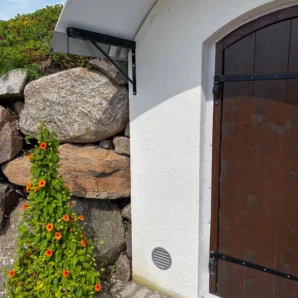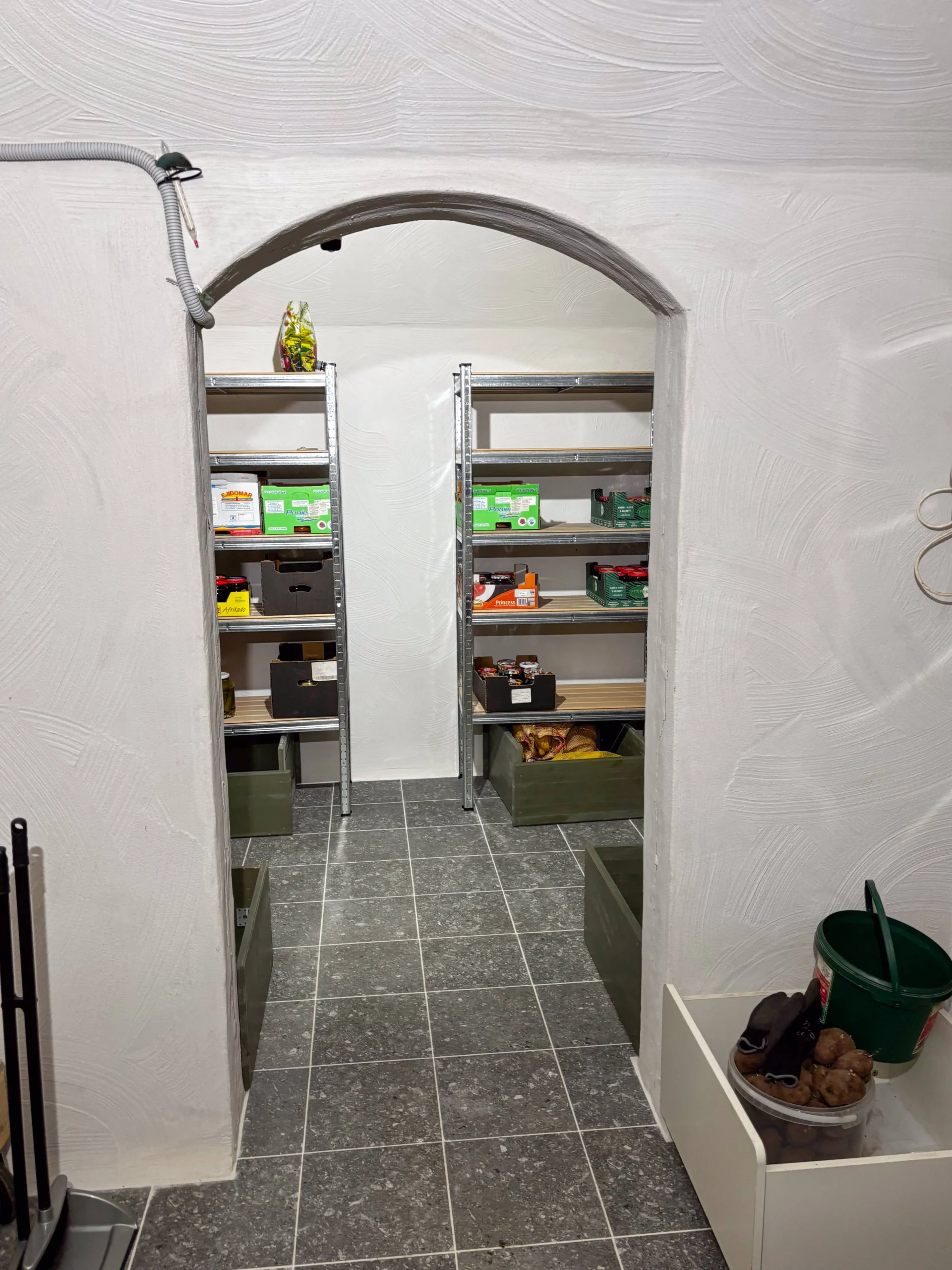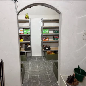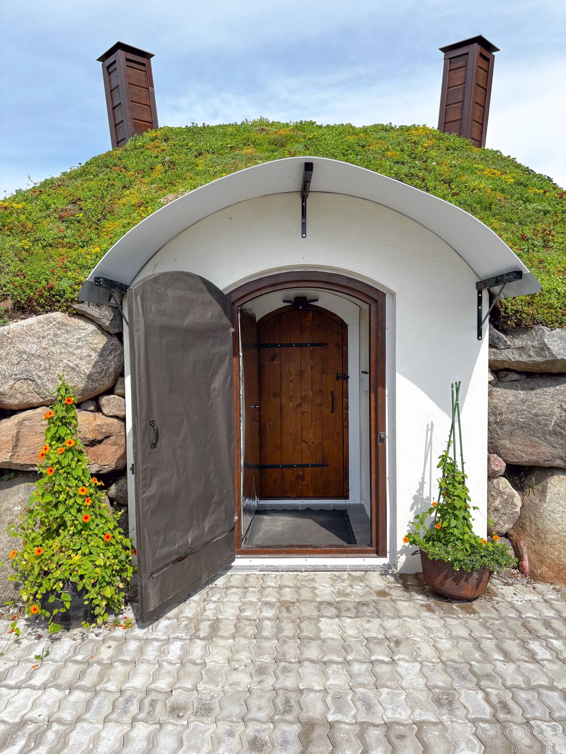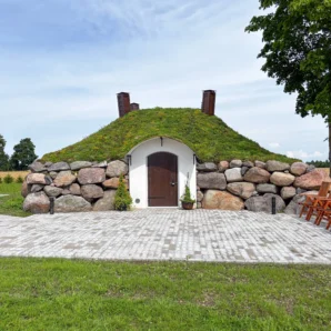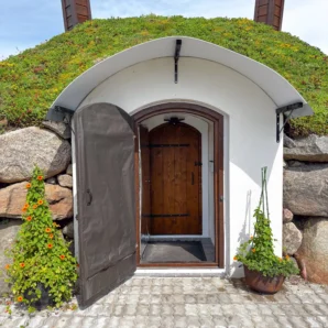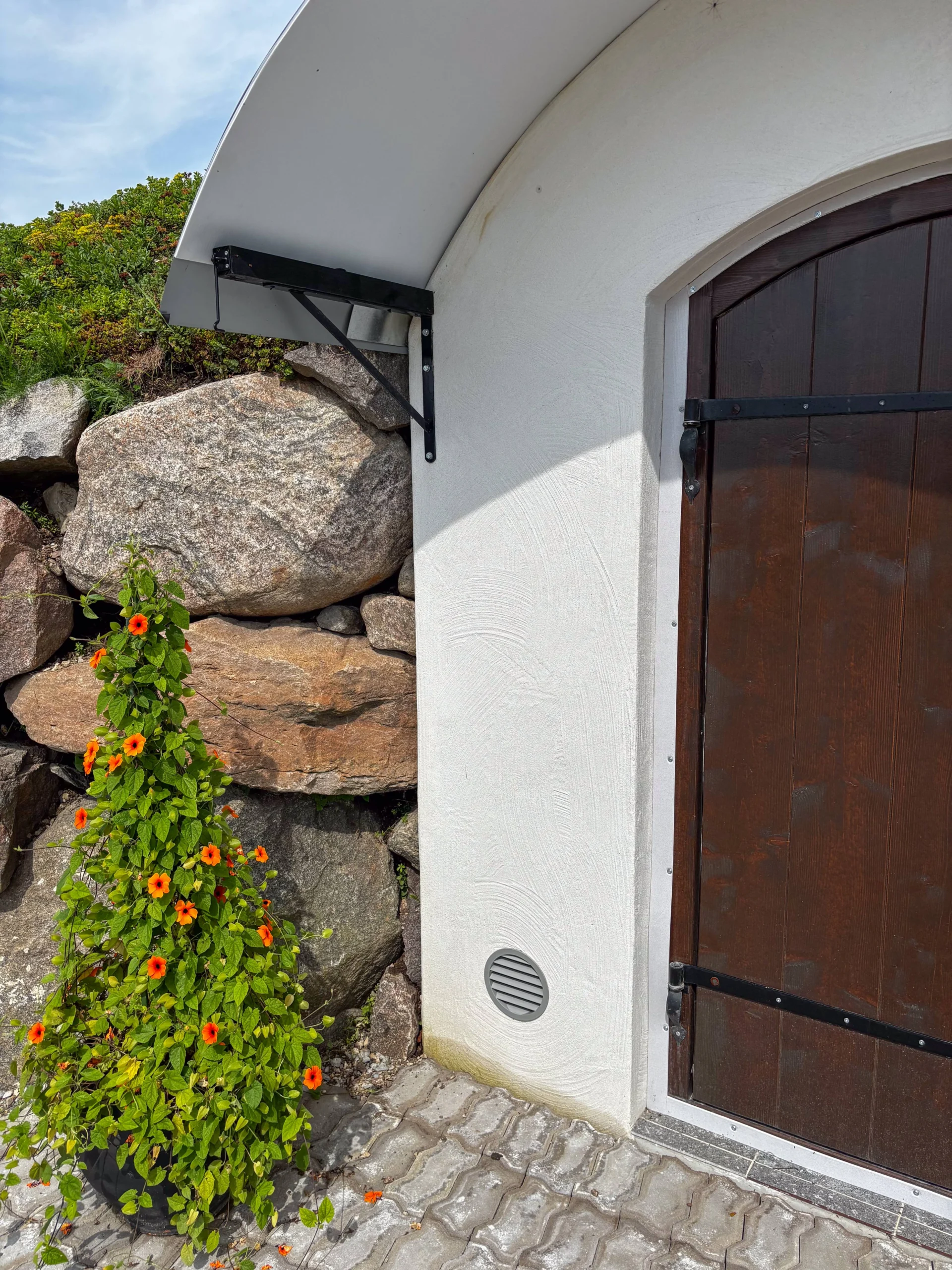 Orissaares asuv maakelder on ehe näide sellest, kuidas traditsiooniline käsitöö, looduslikud materjalid ja kaasaegne esteetika võivad luua koha, mis tundub ühtaegu nii ajatu kui ka uudne. Keldri kaarjas sissepääs on viimistletud heleda krohviga ning seda raamib tume puituks – elegantne kontrast, mis toob esile nii materjalide loomuliku ilu kui ka käsitööna valminud detaile. Ukse kõrvale paigutatud lillepott lisab kodusust ja värvi, pehmendades robustset kivimüüri. Keldri katust katavad kukeharjamatid, mis loovad elava ja hooldusvaba rohelise pinna. Need taimed muudavad keldri maastiku loomulikuks osaks ning tagavad suurepärase soojustuse — temperatuur püsib aastaringi ühtlaselt jahedana.